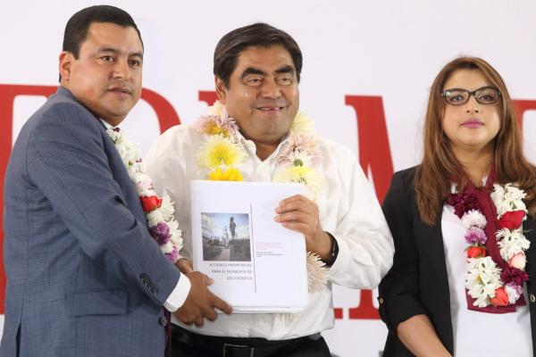 ZACAPOAXTLA, Pue.- La construcción de un centro de convenciones, de una central de abasto y una central camionera, prometió en este municipio el gobernador Miguel Barbosa Huerta, al asistir al primer informe de labores del alcalde Ebodio Santos Alejo.