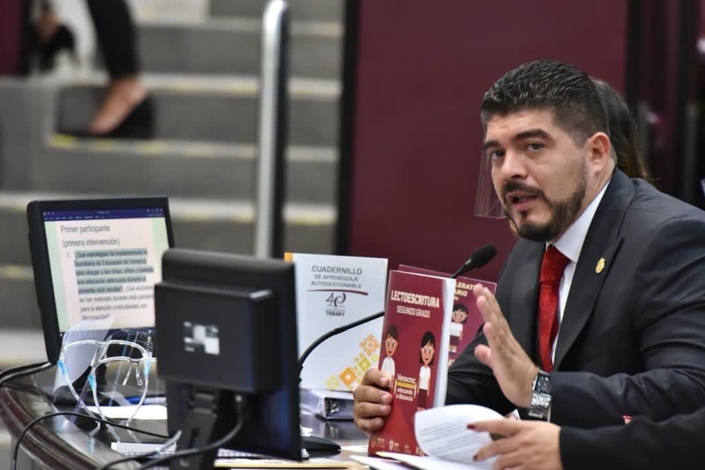 El funcionario presentó los resultados más sobresalientes en la materia, ante la Comisión Permanente de Educación y Cultura de la LXV Legislatura, integrada por los diputados León David Jiménez Reyes y Víctor Emmanuel Vargas Barrientos y la diputada Adriana Esther Martínez Sánchez, presidente, secretario y vocal respectivamente, en tres grandes rubros: los aspectos administrativos atendidos por la dependencia a su cargo, las respuestas ante la pandemia y la deuda histórica con las instituciones escolares que carecen de lo básico para funcionar.