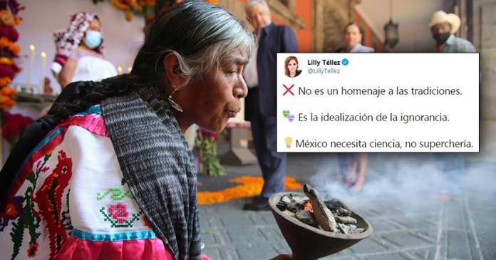 Regeneración, 1 de noviembre de 2020. Su nombre es Teresa Ríos, rezadora y chamana, y realizaba un ritual de limpia en la despedida de los fieles difuntos, pero la senadora panista Lilly Téllez tachó su ritual de «ignorante» y «superchería».