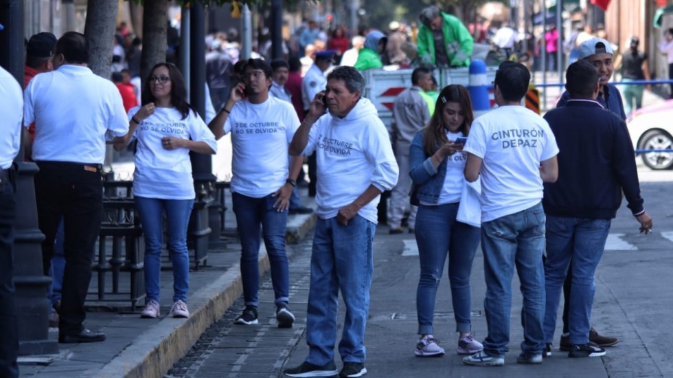 Integrantes del llamado ‘cinturón de paz‘ comenzaron a llegar a las calles del Centro Histórico de la Ciudad de México, previo a la marcha para conmemorar el 51 Aniversario de la represión del 2 de octubre de 1968.