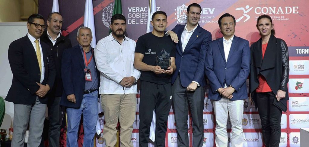 Boca del Río, Ver., 07 febrero de 2020.- El gobernador Cuitláhuac García Jiménez y la directora general de la Comisión Nacional de Cultura Física y Deporte (CONADE), Ana Gabriela Guevara, fueron los encargados de premiar a los campeones de las diferentes divisiones del Torneo Cuadrangular de Boxeo 2020, el cual se realizó en el Salón Tajín 1 del World Trade Center (WTC).